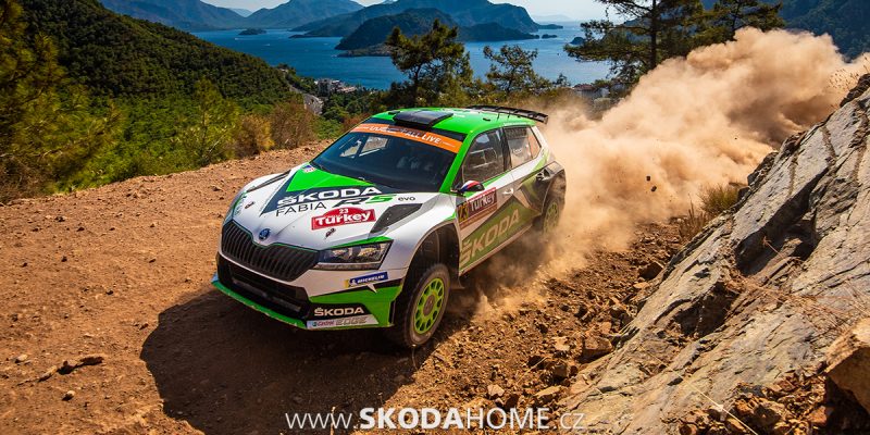 › Jan Kopecký s Pavlem Dreslerem s vozem ŠKODA FABIA R5 evo dojeli v kategorii WRC 2 Pro na Turecké rallye, jedenáctém kole mistrovství světa, na druhém místě