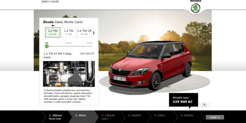 První automobil ŠKODA, který si můžou zákazníci na internetových stránkách společnosti www.skoda-auto.cz vybrat již za pomocí nového Car Configuratoru je akční model ŠKODA Fabia Monte Carlo. V následujícím období bude pilotní aplikace doplněna i o další modely a verze vozů ŠKODA. Nový on-line Car Configurator by se měl stát jedním z hlavních produktových komunikačních kanálů směrem k zákazníkům a podpořit růstovou strategií značky ŠKODA.