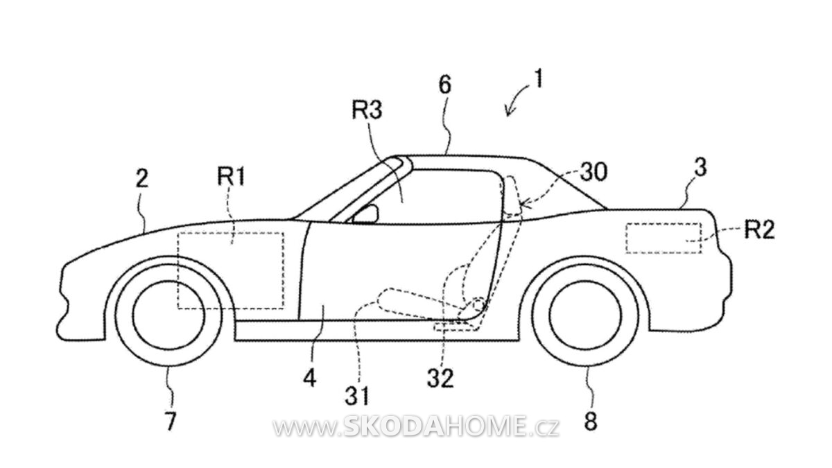Příkladem je tento patent společnosti Mazda, podaný v říjnu 2024, ale zveřejněný až dříve v dubnu. Nese jednoduchý název „Elektrický automobil“, ale výkresy v něm obsažené rozhodně připomínají Miatu. Uvádí se, že by se jedná o konstrukci, která by mohla fungovat v sedanu nebo jiných typech vozidel, ale popis a výkresy se rozhodně zaměřují na malý sportovní vůz.