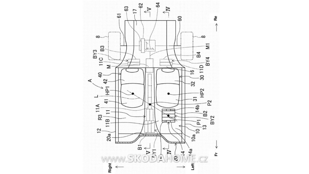Konstrukce také umožňuje prostor pro další bateriové bloky strategicky umístěné dále od středu. Patent ukazuje menší bateriové bloky namontované za každým sedadlem. Před sedadlem spolujezdce je také baterie, která slouží k vyrovnání hmotnosti řidiče. Mazda bere tuto otázku vyvážení velmi vážně.